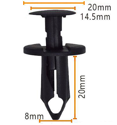 De body van de clip meet 20 mm lang en loopt af tot een 8 mm brede basis, waardoor het nauw op zijn plaats past en stabiliteit kan behouden, zelfs onder druk. Dankzij het unieke ontwerp van deze clips kunnen ze worden gebruikt in een breed scala van industrieën, waaronder automotive, constructie en productie.